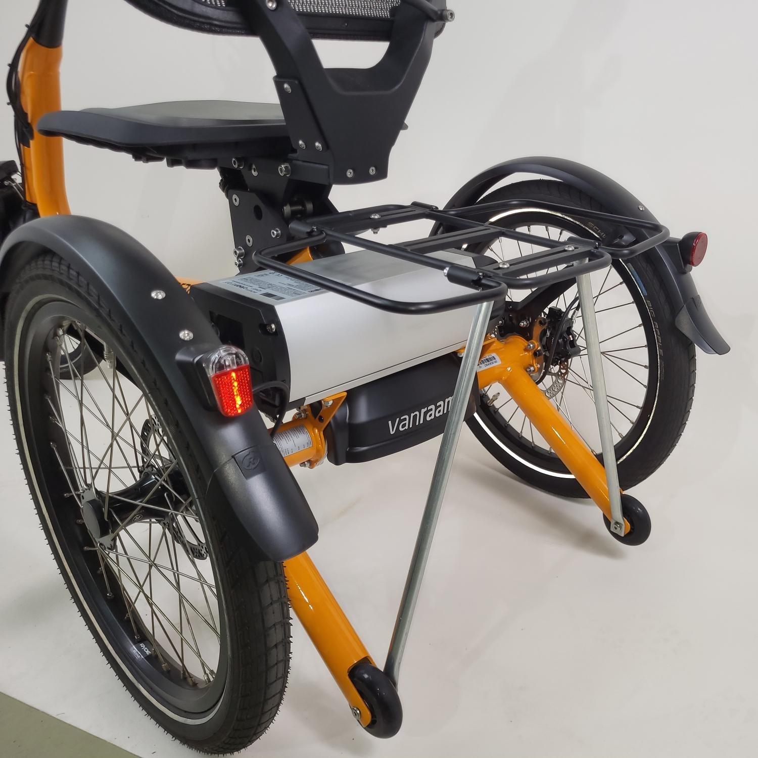 JP7050; Butterfly drager op Van Raam 3 wieler. Deze Drager heeft opklapbare vleugels zodat de accu bereikbaar blijft om er af te halen.